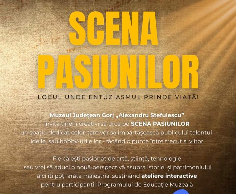 Muzeul Județean Gorj „Alexandru Ștefulescu” inițiază un nou proiect, dedicat tinerilor creativi care vor să împărtășească cu publicul pasiunile, talentele și ideile. Intitulat “Scena Pasiunilor”, acest proiect promite ca indiferent de domeniul pe care îl preferi, să excelezi.
