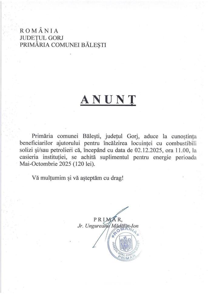 Primăria Comunei Bălești a emis un anunț important destinat locuitorilor care beneficiază de ajutor pentru încălzirea locuinței cu combustibili solizi și/sau petrolieri.
