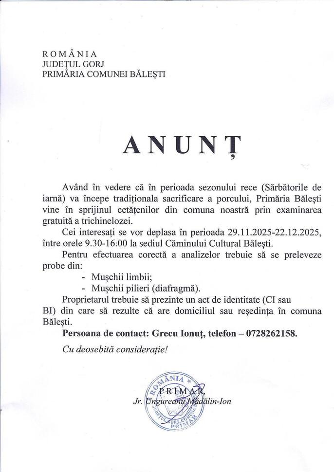 Primăria Comunei Bălești vine în sprijinul cetățenilor săi și anunță că, în perioada sezonului rece, odată cu începerea tradiționalei sacrificări a porcului, va oferi examinarea gratuită a probelor pentru trichineloză.