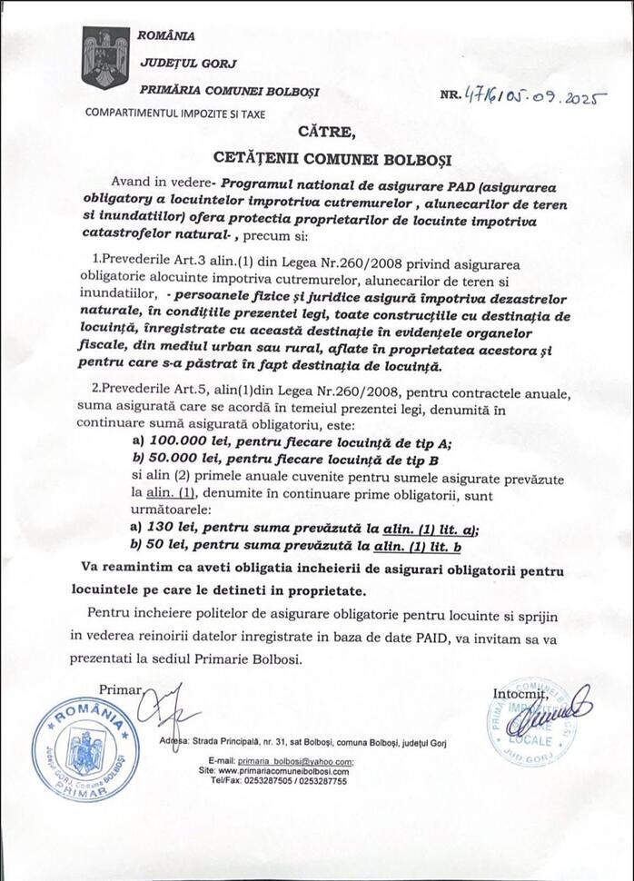 Primăria Comunei Bolboși, din județul Gorj, informează toți proprietarii de imobile despre importanța și obligativitatea încheierii polițelor de asigurare PAD. Această măsură legală este menită să ofere protecție financiară în fața unor dezastre naturale precum cutremurele, inundațiile sau alunecările de teren.