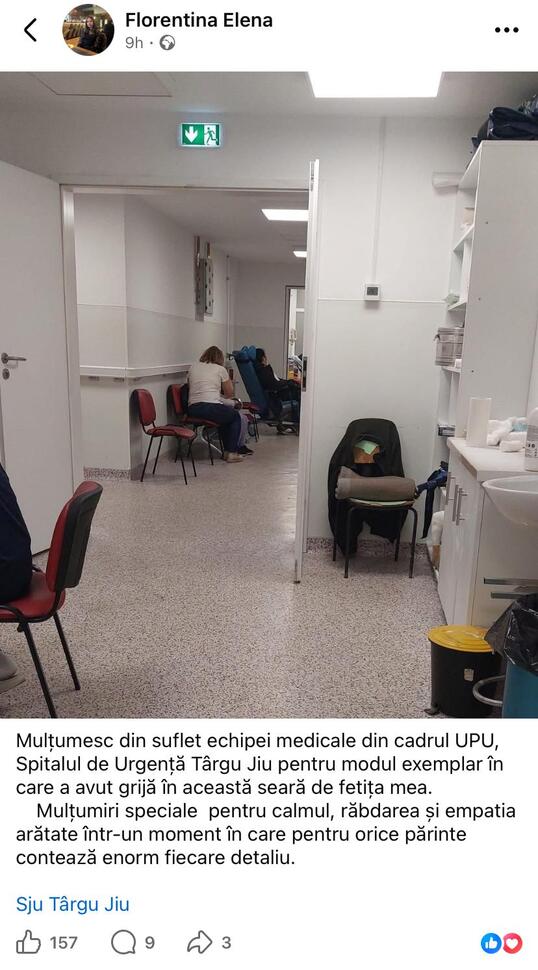 “Mulțumesc din suflet echipei medicale din cadrul UPU, Spitalul de Urgență Târgu Jiu pentru modul exemplar în care a avut grijă de fetița mea.