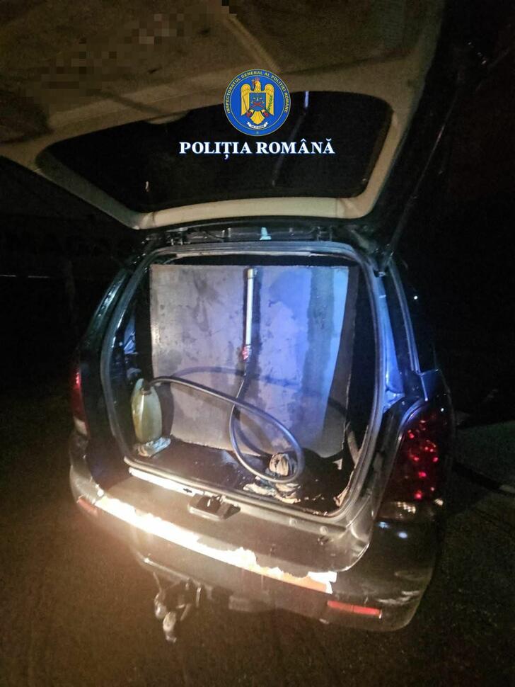 Potrivit comunicatului instituției, polițiștii au descoperit la fața locului un autoturism modificat artizanal, folosit în activitatea infracțională, în interiorul căruia a fost identificat un bazin improvizat încărcat cu aproximativ 1.200 de litri de țiței.