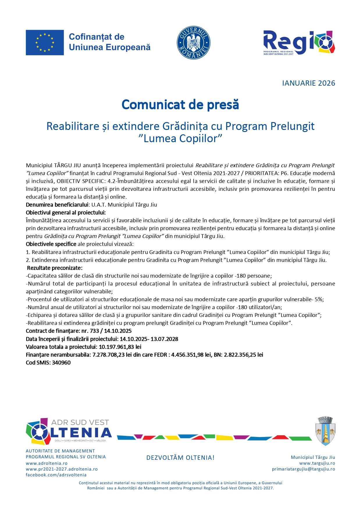 Comunicat de presă Reabilitare și extindere Grădiniţa cu Program Prelungit ”Lumea Copiilor”