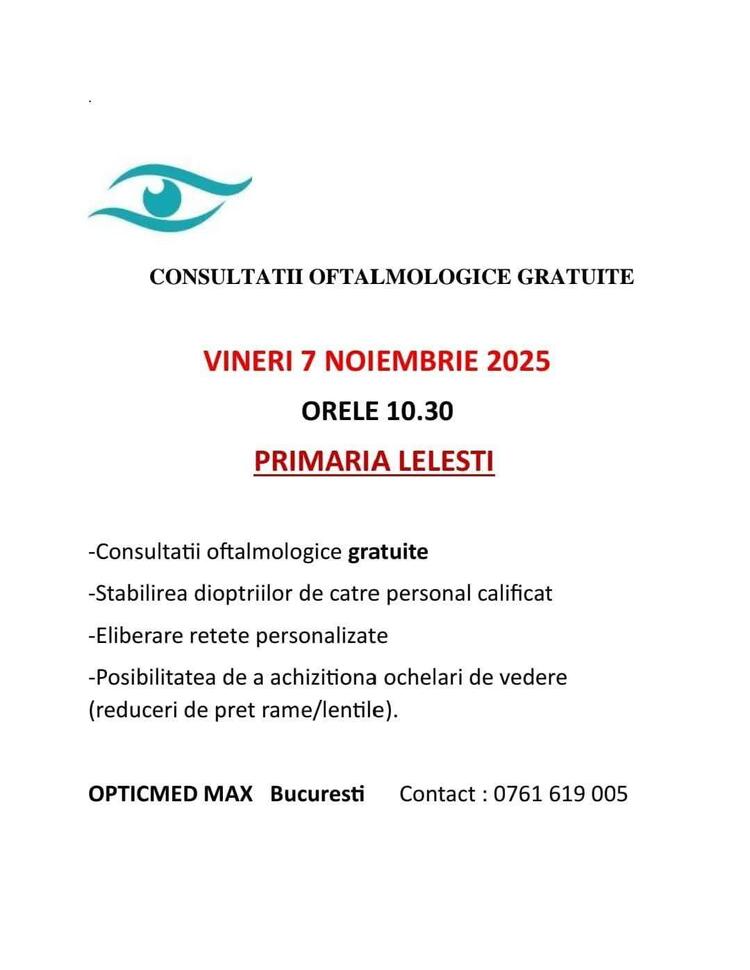 Locuitorii din comuna Lelești sunt invitați să beneficieze de consultații oftalmologice gratuite oferite de Opticmed Max București.