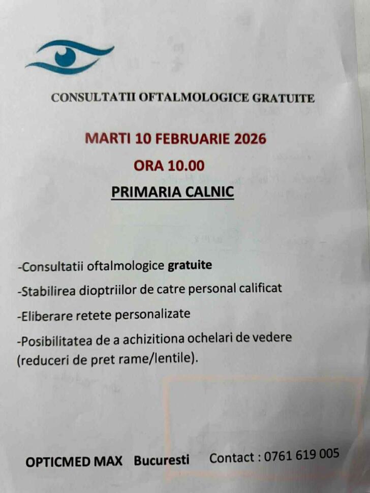 Primăria comunei Câlnic, județul Gorj, organizează marți, 10 februarie, o acțiune de consultații oftalmologice gratuite, care va avea loc la sediul primăriei.