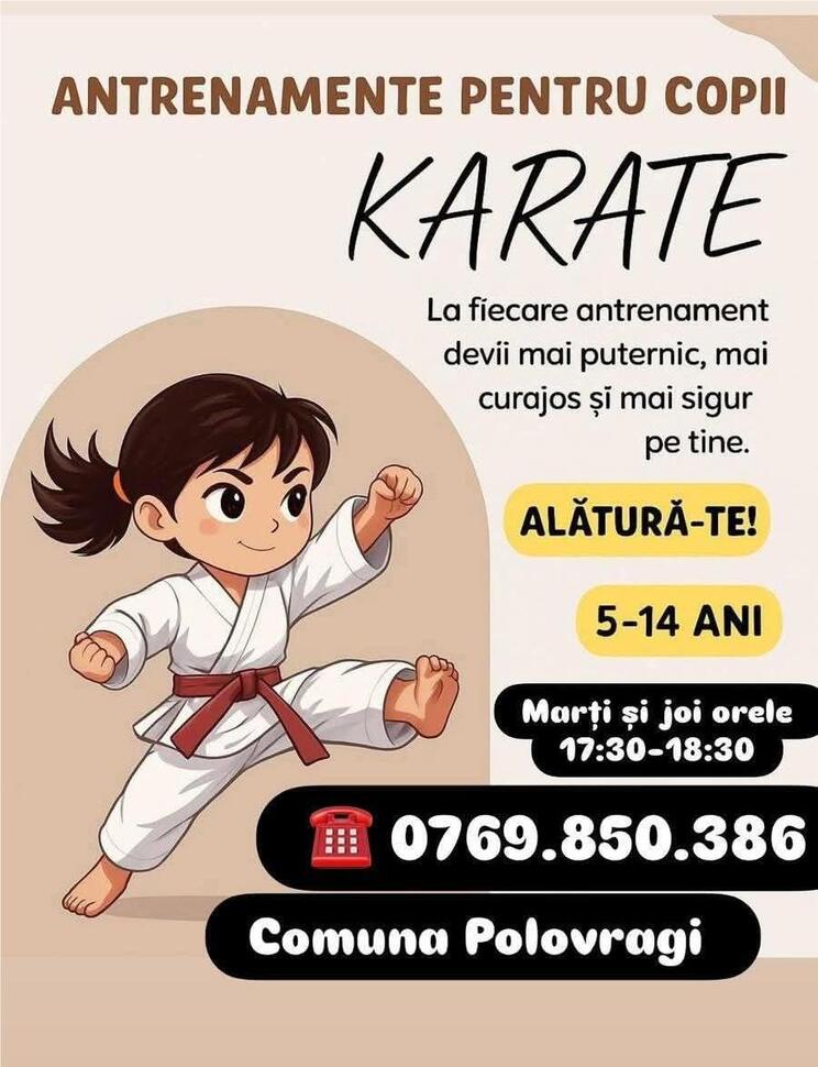 Primăria comunei Polovragi anunță demararea unui program de antrenamente de karate, adresat copiilor cu vârste între 5 și 14 ani. Ședințele vor avea loc de două ori pe săptămână, marțea și joia, între orele 17:30 și 18:30, chiar în localitate.