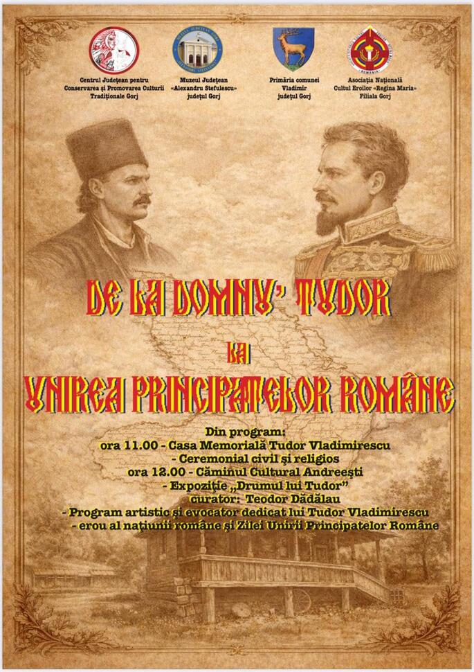 Centrul Județean pentru Conservarea și Promovarea Culturii Tradiționale Gorj, Muzeul Județean „Alexandru Ștefulescu” Gorj, Primăria Comunei Vladimir și Asociația Națională „Cultul Eroilor – Regina Maria” – Filiala Gorj organizează, așadar, în data de 23 ianuarie 2026, evenimentul cultural „De la Domnu’ Tudor la Unirea Principatelor Române”, dedicat memoriei lui Tudor Vladimirescu, erou al națiunii române, și Zilei Unirii Principatelor Române.
