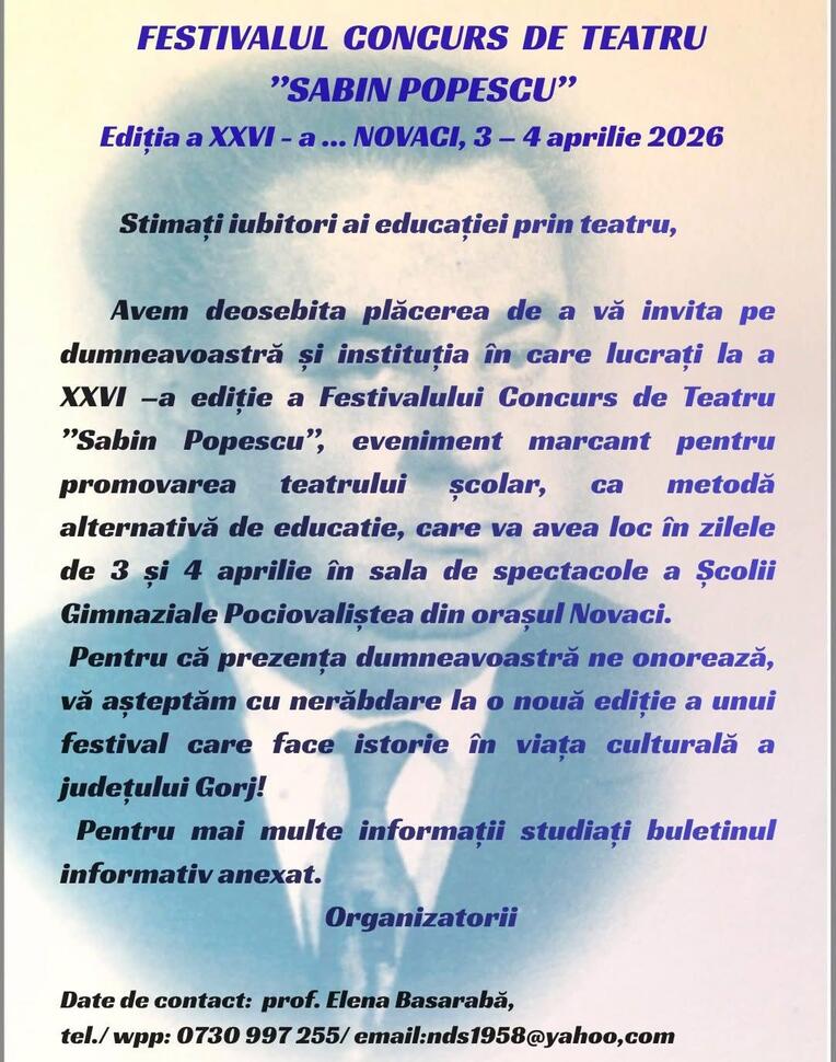 Orașul Novaci va găzdui, în perioada 3-4 aprilie 2026, cea de-a XXVI-a ediție a Festivalului Concurs de Teatru „Sabin Popescu”.
