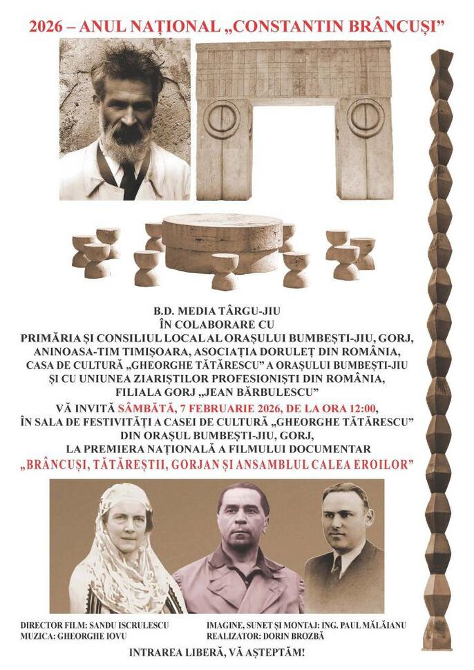Debutul Anului Național „Constantin Brâncuși” este marcat în județul Gorj printr-un eveniment cultural de excepție, găzduit în acest weekend de orașul Bumbești-Jiu. Sâmbătă, 7 februarie 2026, începând cu ora 12:00, Casa de Cultură „Gheorghe Tătărescu” va fi scena premierei naționale a filmului documentar „Brâncuși, Tătăreștii, Gorjan și Ansamblul Calea Eroilor”, o producție ce explorează rădăcinile gorjene ale marelui sculptor și moștenirea sa universală.
