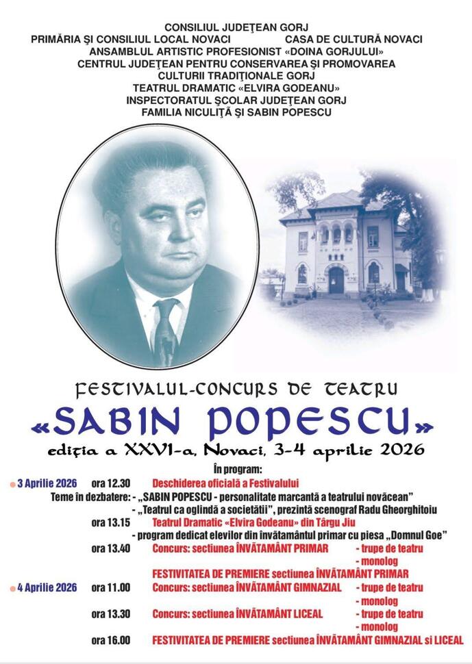 În zilele de 3 și 4 aprilie 2026, orașul Novaci va fi gazda Festivalului Concurs de teatru "Sabin Popescu", la care vor participa peste 200 de copii și tineri din trei județe: Dolj, Vâlcea și Gorj.