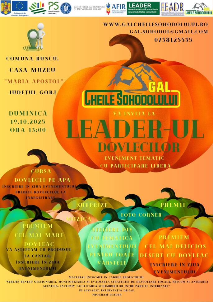 Un eveniment special va avea loc la sfârșitul acestei săptămâni, în comuna Runcu din județul Gorj. Intitulat Leader-ul Dovlecilor, evenimentul tematic este cu participare liberă, astfel încât organizatorii așteaptă gorjeni, din toate colțurile județului, pentru a lua parte la programul manifestărilor. Acestea vor avea loc duminică, 17 octombrie, începând cu ora 13:00.
