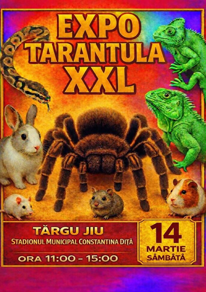 Locuitorii din Târgu Jiu au ocazia să descopere, în acest weekend, unele dintre cele mai fascinante creaturi exotice din lume. Expoziția TARANTULA XXL va avea loc sâmbătă, 14 martie, la Stadionul Municipal „Constantina Diță”, unde vizitatorii vor putea vedea de aproape tarantule impresionante, șerpi exotici, iguane verzi și alte animale neobișnuite.