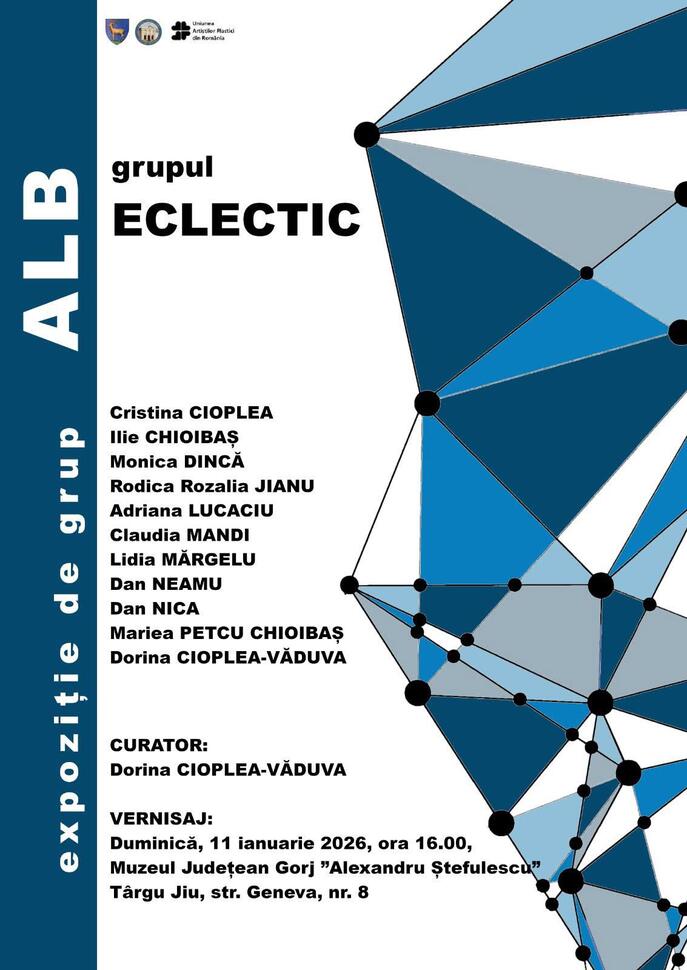 Duminică, 11 ianuarie 2026, de la ora 16.00, la Muzeul Județean Gorj ”Alexandru Ștefulescu” din Târgu Jiu (str. Geneva, nr. 8) va avea loc vernisajul expoziției de arte vizuale ”Alb” a grupului ECLECTIC, format din artiștii Cristina CIOPLEA, Ilie CHIOIBAȘ, Monica DINCĂ, Rodica Rozalia JIANU, Adriana LUCACIU, Claudia MANDI, Lidia MĂRGELU, Dan NEAMU, Dan NICA, Mariea PETCU CHIOIBAȘ, Dorina CIOPLEA-VĂDUVA.