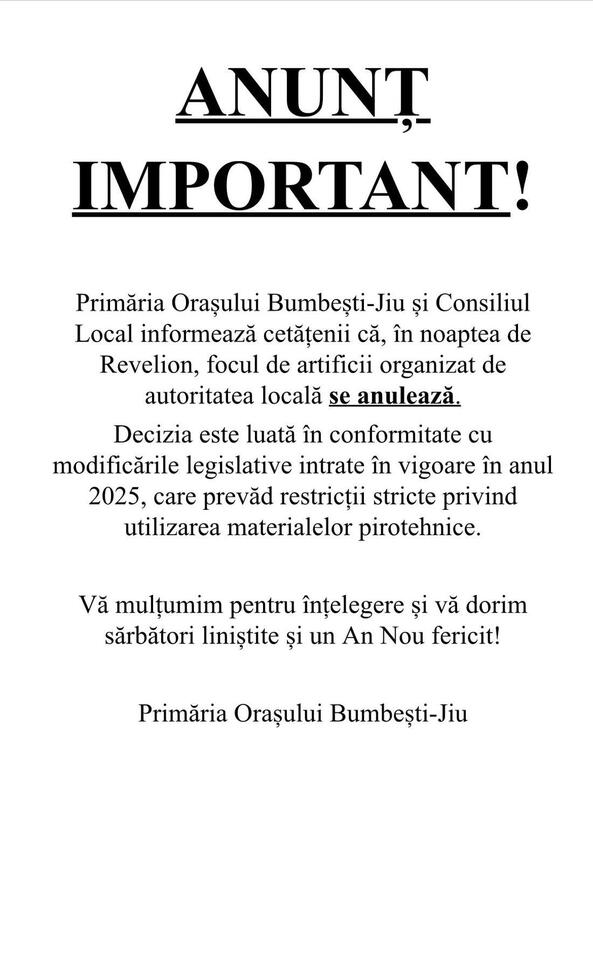 Fără lumini și explozii la miezul nopții în Bumbești-Jiu. Primăria și Consiliul Local au anunțat oficial anularea focului de artificii programat pentru noaptea de Revelion.