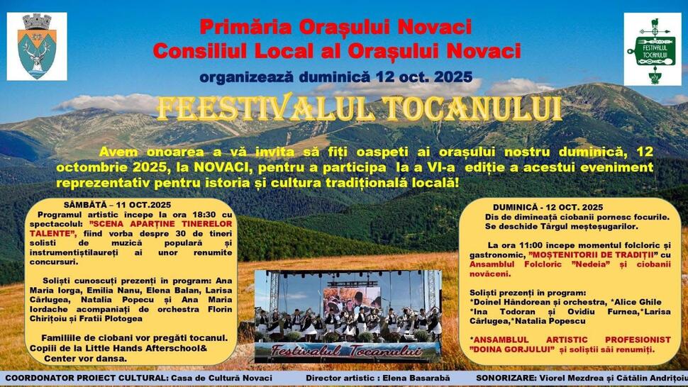 Orașul Novaci găzduiește a VI-a ediție a „Festivalului Tocanului” în weekendul 11-12 octombrie 2025.