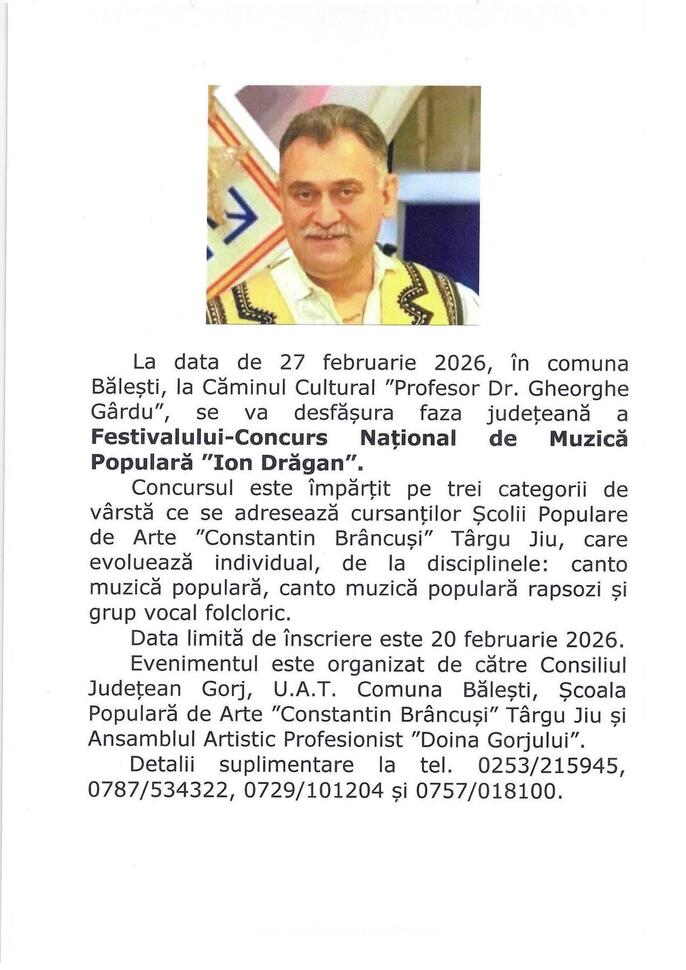 Cei care doresc să participe trebuie să știe că înscrierile sunt deschise până la data de 20 februarie 2026. Această manifestare culturală de amploare este organizată prin efortul comun al Consiliului Județean Gorj, al Primăriei Comunei Bălești, al Școlii Populare de Arte „Constantin Brâncuși” și al Ansamblului Artistic Profesionist „Doina Gorjului”. Pentru detalii suplimentare și înscrieri, organizatorii pun la dispoziție numerele de telefon 0253/215945, 0787/534322, 0729/101204 și 0757/018100.