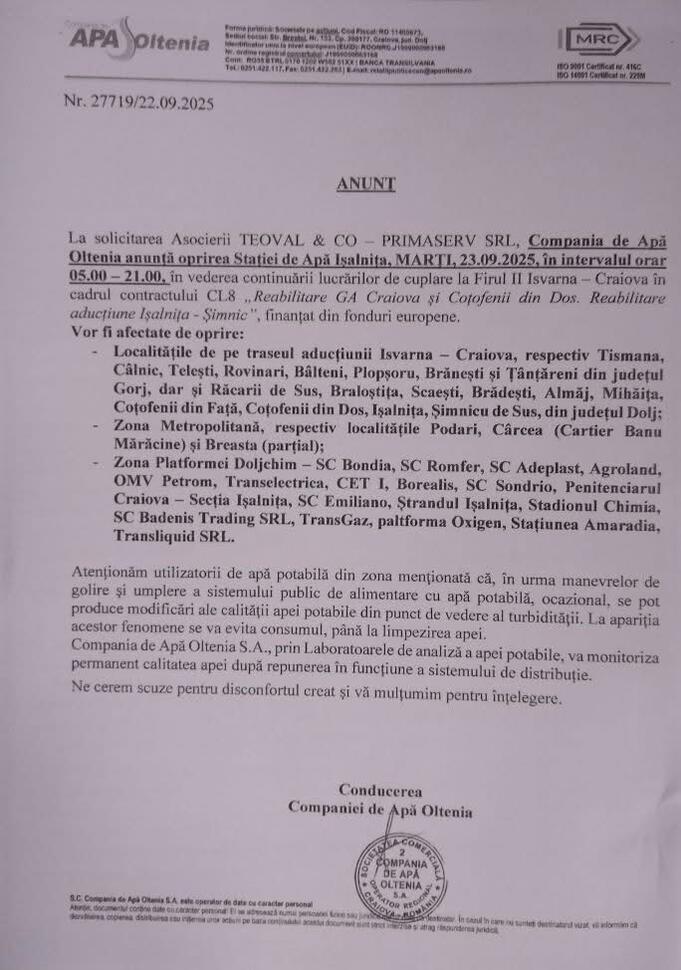 Compania de Apă Oltenia anunță o întrerupere majoră a furnizării apei la Stația de Apă Ișalnița, programată pentru marți, 23 septembrie 2025. Sute de mii de locuitori și zeci de companii din județele Gorj și Dolj vor rămâne fără apă potabilă timp de 16 ore, în intervalul orar 05:00 - 21:00.