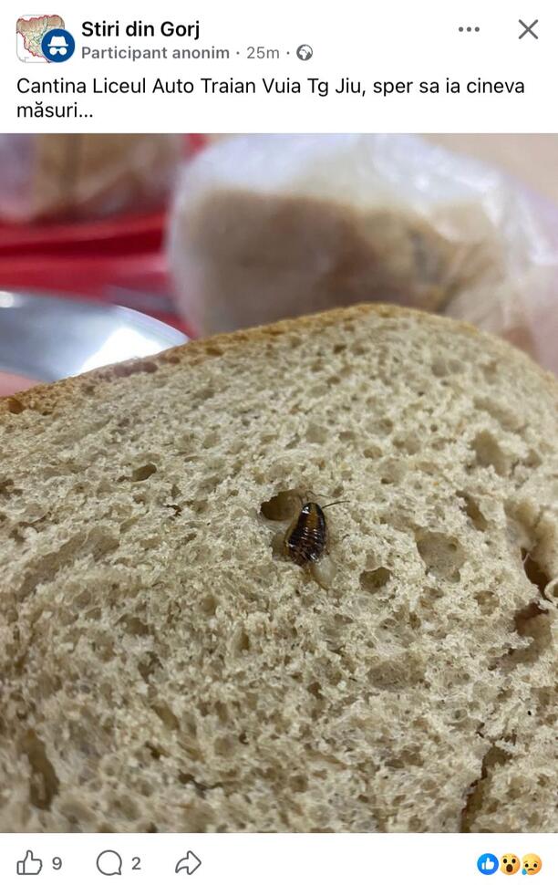 O imagine publicată de un utilizator anonim pe rețelele de socializare arată o insectă pe o felie de pâine, despre care se afirmă că ar fi fost servită la cantina Liceului Auto „Traian Vuia” din Târgu Jiu.