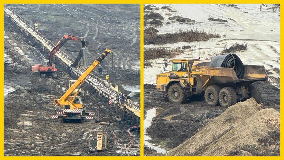 Tronsonul de bandă aferent excavatorului 04 a fost avariat grav, prin spintecare pe mijloc, aproape pe toată lungimea.