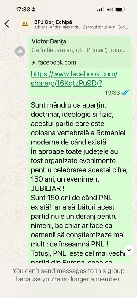 Mesajul sugerează că ar fi un om care s-a opus sistemului și a fost sancționat pentru asta. Însă, în lipsa unor dovezi clare privind presiunile invocate, această poziționare riscă să pară mai degrabă o strategie de victimizare decât o demonstrație de integritate. Banța prezintă doar niște probe că liderul PNL Gorj a cerut să fie scos din grupuri interne de comunicare ale partidului, doar pentru că bătea câmpii. Și oricum nu avea ce căuta acolo, dacă nu era membru al PNL.