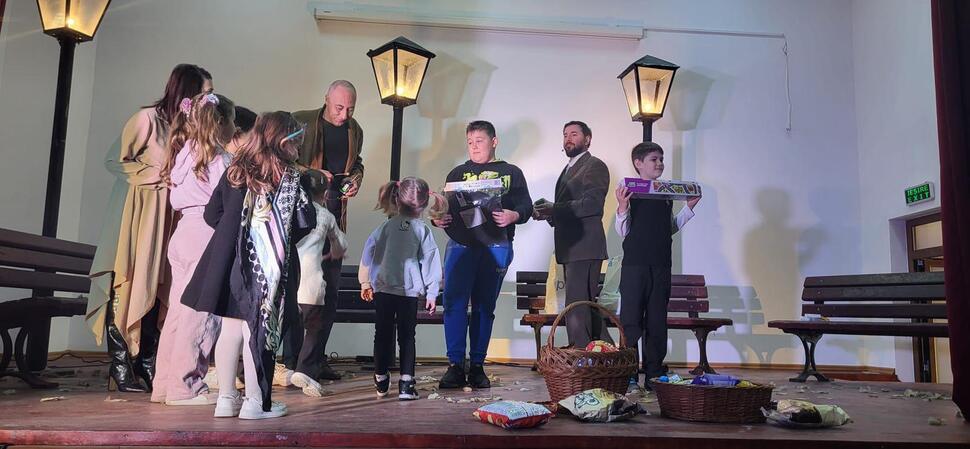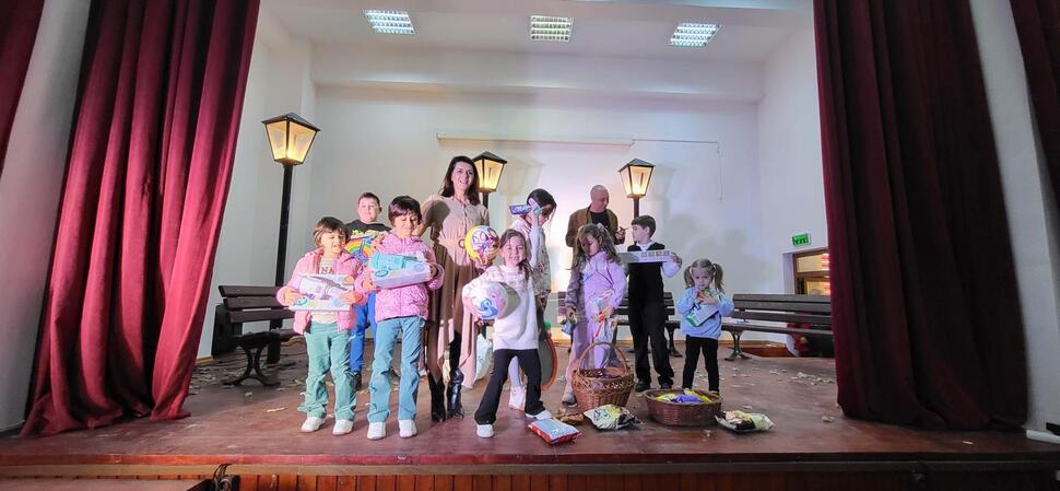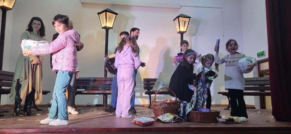 Reprezentația actorilor a fost urmată de un moment interactiv plin de entuziasm, în care personajele de pe scenă au coborât în mijlocul micuților pentru a sărbători anticipat venirea Paștelui. Jocul „Darul Iepurașului” a transformat sala într-un spațiu al veseliei, culminând cu oferirea de dulciuri și cadouri pentru toți copiii prezenți, sub privirile emoționate ale învățătoarelor de la școlile din localitate.