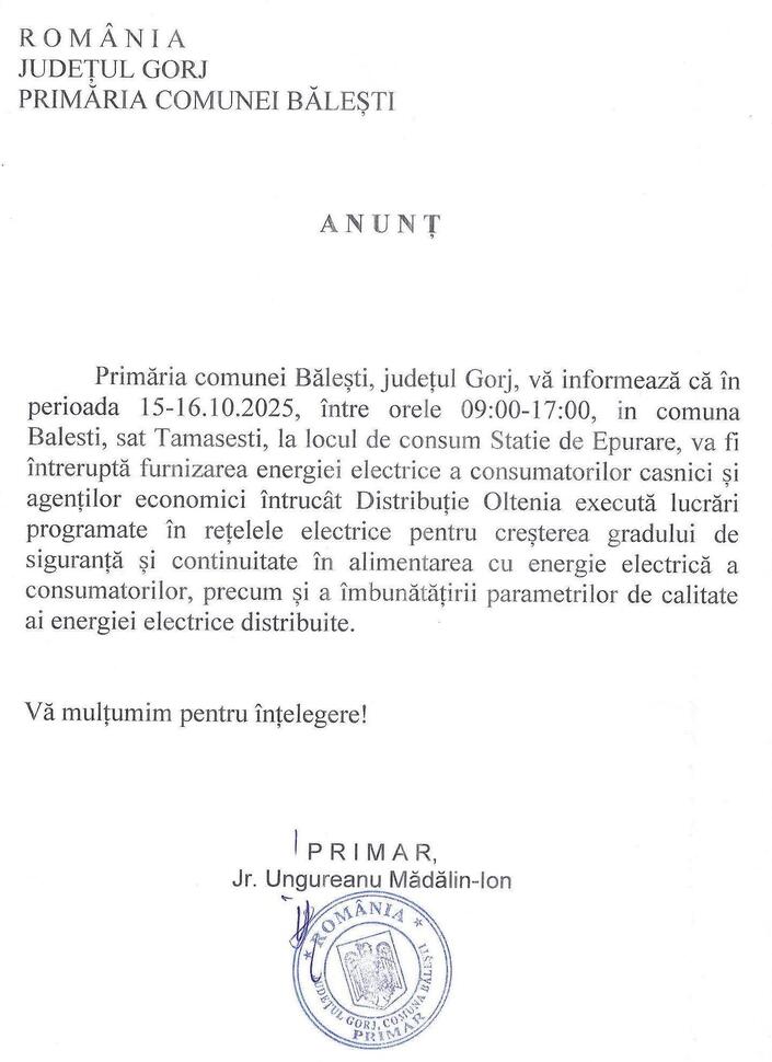 Primăria comunei Bălești, județul Gorj, a anunțat oficial că locuitorii din satul Tămășești vor rămâne fără curent electric timp de două zile, din cauza unor lucrări esențiale la rețeaua electrică.