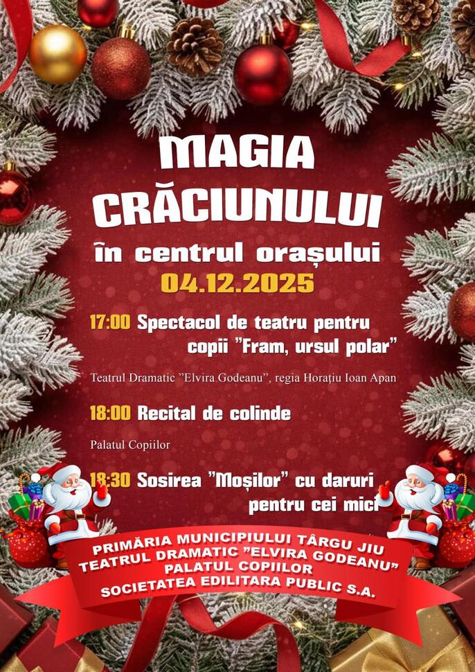 "Primăria Municipiului Târgu Jiu, în colaborare cu Teatrul Dramatic „Elvira Godeanu”, Palatul Copiilor Târgu Jiu și Edilitara Public SA, vă invită la un eveniment plin de lumină, emoție și magie pentru cei mici și cei mari!