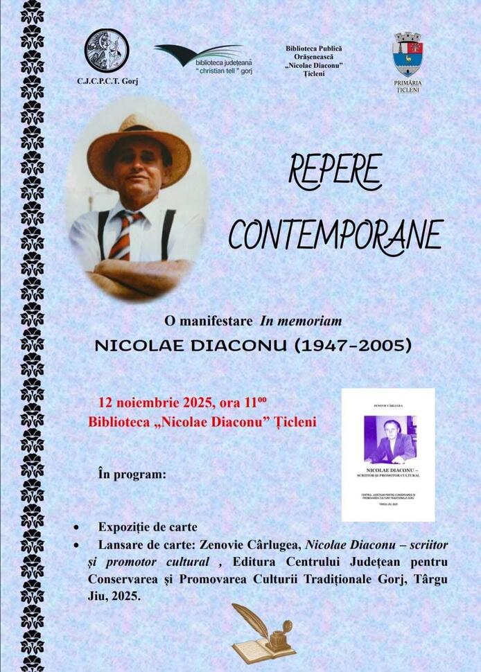 Centrul Județean pentru Conservarea și Promovarea Culturii Tradiționale Gorj, împreună cu Biblioteca Județeană „Christian Tell” Gorj, Primăria Țicleni, Biblioteca „Nicolae Diaconu” Țicleni și Casa de Cultură Țicleni, transmit că miercuri, 12 noiembrie 2025, începând cu ora 11:00, va avea loc manifestarea dedicată memoriei și operei lui Nicolae Diaconu (1947–2005), unul dintre cei mai importanți poeți, critici literari și promotori culturali gorjeni ai secolului XX.