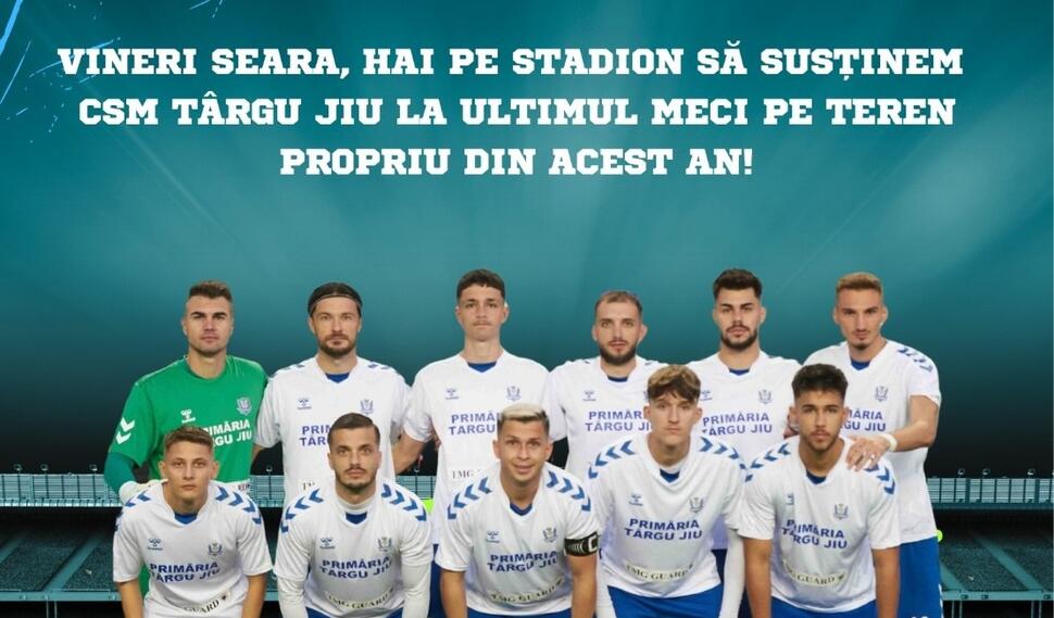 CSM Târgu Jiu va disputa vineri, 5 decembrie, ultimul meci pe teren propriu din acest an. Echipa lui Mario Găman primește vizita grupării Jiul Petroșani. Partida contează pentru etapa a 16-a din Seria a 6-a din Liga 3. Meciul de vineri va începe la ora 17.00, iar suporterii echipei sunt așteptați în număr cât mai mare la stadion pentru a susține echipa. ”Am încredere că lumea va veni la stadion, chiar dacă timpul nu este în favoarea noastră, pentru că avem mare nevoie. Sper să ne susțină, iar noi trebuie să fim concentrați pe tot parcursul jocului și să reușim trei puncte de care avem mare nevoie”, a prefațat confruntarea de vineri, antrenorul Mario Găman, care a făcut un apel către suporterii echipei să vină la meci.