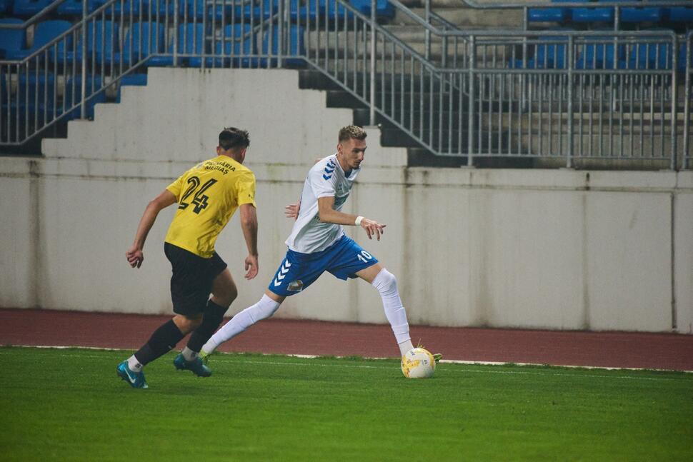 A fost o seară în care nimic nu a mers în angrenajul echipei noastre. Prima acțiune a oaspeților a adus și primul gol, în urma unui corner. Era minutul 5, când mingea expediată de Cristian Cocan a fost deviată de Lucian Marina. Traiectoria balonului l-a păcălit și pe portarul Oprița și a ajuns în plasa porții noastre. Băieții lui Mario Găman au încercat să treacă peste acest moment și au început să pună presiune pe careul advers, în încercarea de a restabili echilibrul. Adelin Pîrcălabu a fost foarte aproape în minutul 13, la un șut-centrare, care a șters puțin bara. Mai bine de 20 de minute a durat presiunea la poarta Mediașului, dar fără rezultat. Oaspeții au reușit să treacă destul de lejer de minutele de presiune și au amenințat din nou poarta gorjenilor. O nouă fază fixă a adus golul 2. Era minutul 29, când experimentatul atacant Victor Astafei, jucător cu meciuri la Liga 1, a marcat cu capul, după o centrare din corner. De pe margine, Mario Găman le-a transmis jucătorilor săi să nu renunțe la luptă, să aibă încredere, chiar dacă tabela arăta 0-2, însă golul doi parcă a turnat plumb în ghetele gorjenilor, care au început să piardă inițiativa. A profitat Mediașul, care a majorat diferența în minutul 39, prin reușita lui Raul Orlandea, care a stabilit scorul la pauză, 0-3.