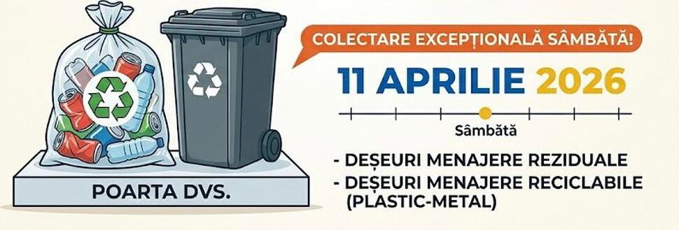 Astfel, pentru a asigura curățenia în localitate și pentru a respecta zilele libere legale, autoritățile locale au decis ca atât colectarea deșeurilor menajere reziduale, cât și a celor reciclabile (plastic și metal), să se desfășoare în aceeași zi. Cetățenii sunt rugați să scoată pubelele și sacii la poartă în cursul zilei de sâmbătă, 11 aprilie 2026, dată la care echipele de salubritate vor acoperi ambele categorii de deșeuri pe întreaga rază a comunei.