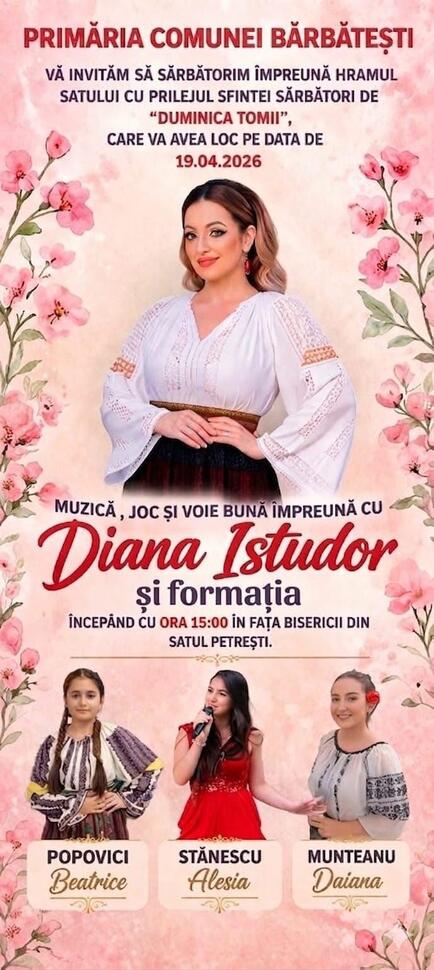 Primăria comunei Bărbătești organizează o mare sărbătoare populară pe data de 19 aprilie 2026, cu ocazia Hramului Satului celebrat de „Duminica Tomii”.