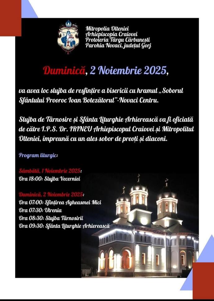 Punctul central al manifestărilor îl constituie slujba de resfințire a Bisericii cu hramul „Soborul Sfântului Prooroc Ioan Botezătorul” – Novaci Centru, care va avea loc Duminică, 2 noiembrie 2025. Slujba va fi oficiată de Înaltpreasfințitul Părinte Dr. Irineu, Mitropolitul Olteniei, alături de un sobor ales de preoți și diaconi.
