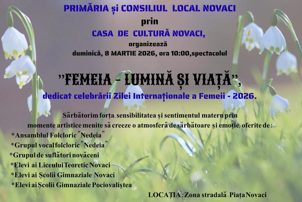 Primăria și Consiliul Local Novaci, prin intermediul Casei de Cultură, invită toți cetățenii să marcheze împreună Ziua Internațională a Femeii printr-un eveniment cultural de excepție. Spectacolul, intitulat sugestiv „Femeia – Lumină și Viață”, este dedicat celebrării forței, sensibilității și sentimentului matern.