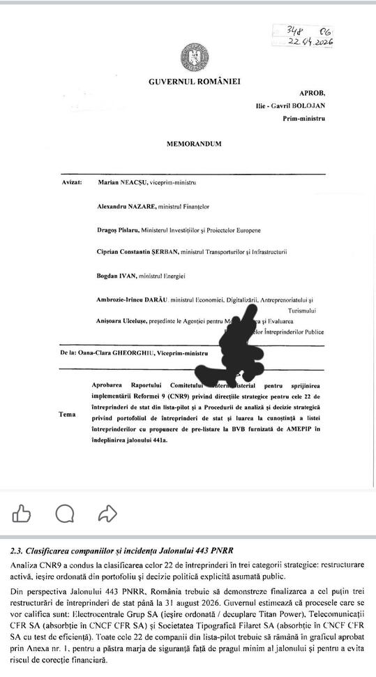 P.S. Iar pentru a încheia subiectul cu Jalonul 443 referitor la listarea/restructurarea a trei companii de stat vă rog să vedeți în poză memorandumul propus de dna VPM care vorbește despre cele trei companii propuse pentru restructurare.”