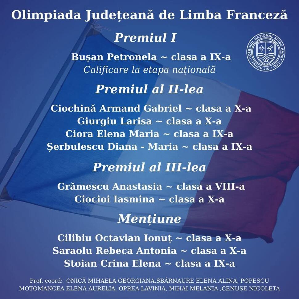 Colegiul Național „Spiru Haret” din Târgu Jiu confirmă încă o dată tradiția excelenței în educație prin rezultatele remarcabile obținute la etapa județeană a Olimpiadei de Limba Franceză.