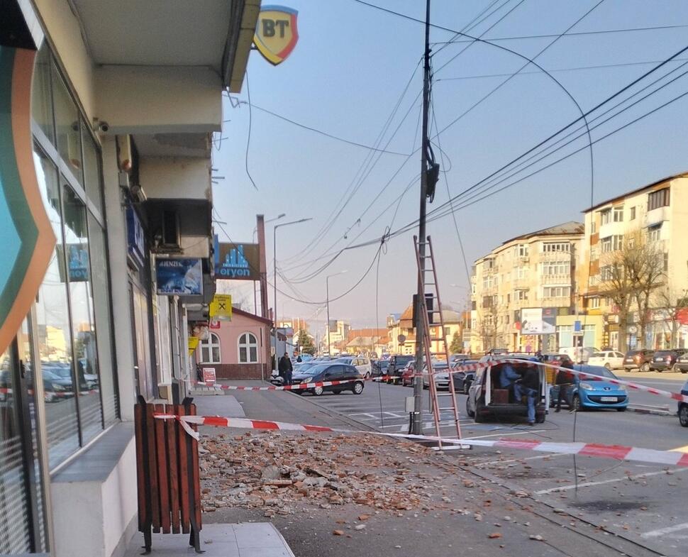 În imaginile surprinse la fața locului se observă cărămizile împrăștiate pe trotuar, chiar în dreptul unor spații comerciale și al unui bancomat, într-o zonă frecventată zilnic de zeci de persoane.