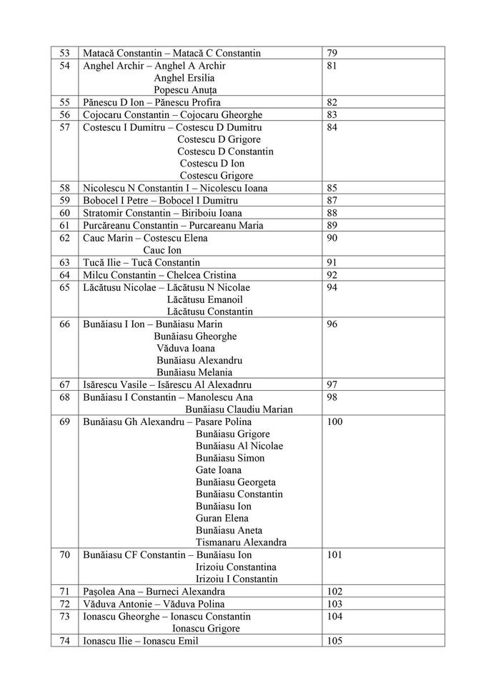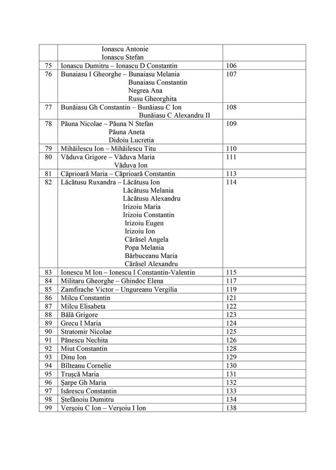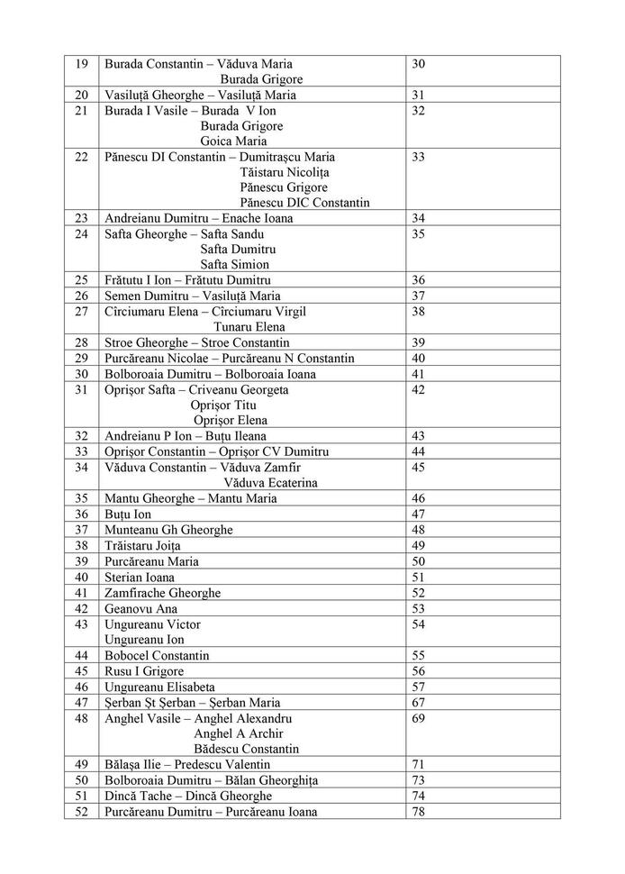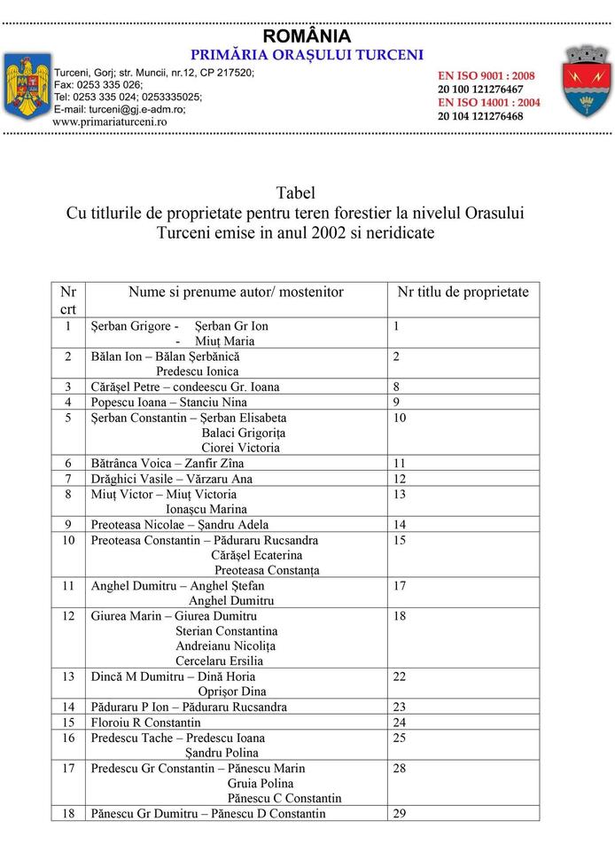 Persoanele din tabelul anexat sau moștenitorii acestora sunt rugate să se prezinte la Compartimentul cadastru, agricultură din cadrul Primăriei Orașului Turceni, în timpul programului de lucru cu publicul, pentru ridicarea titlurilor de proprietate, având asupra lor actul de identitate.