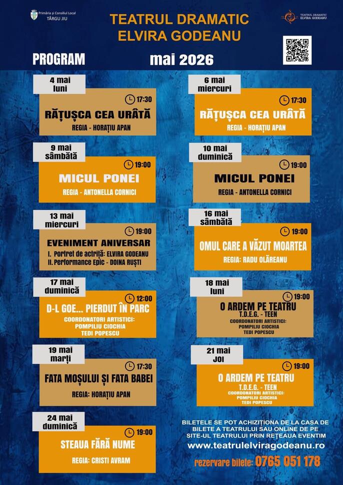 Teatrul Dramatic „Elvira Godeanu” din Târgu Jiu își deschide larg porțile în luna mai 2026, propunând publicului o stagiune diversificată, menită să îmbine teatrul clasic, poveștile pentru copii și evenimentele aniversare. Instituția culturală a anunțat un program încărcat, oferind spectatorilor oportunitatea de a se bucura de seri de neuitat alături de actori îndrăgiți și producții care promit să atingă sufletul privitorilor.