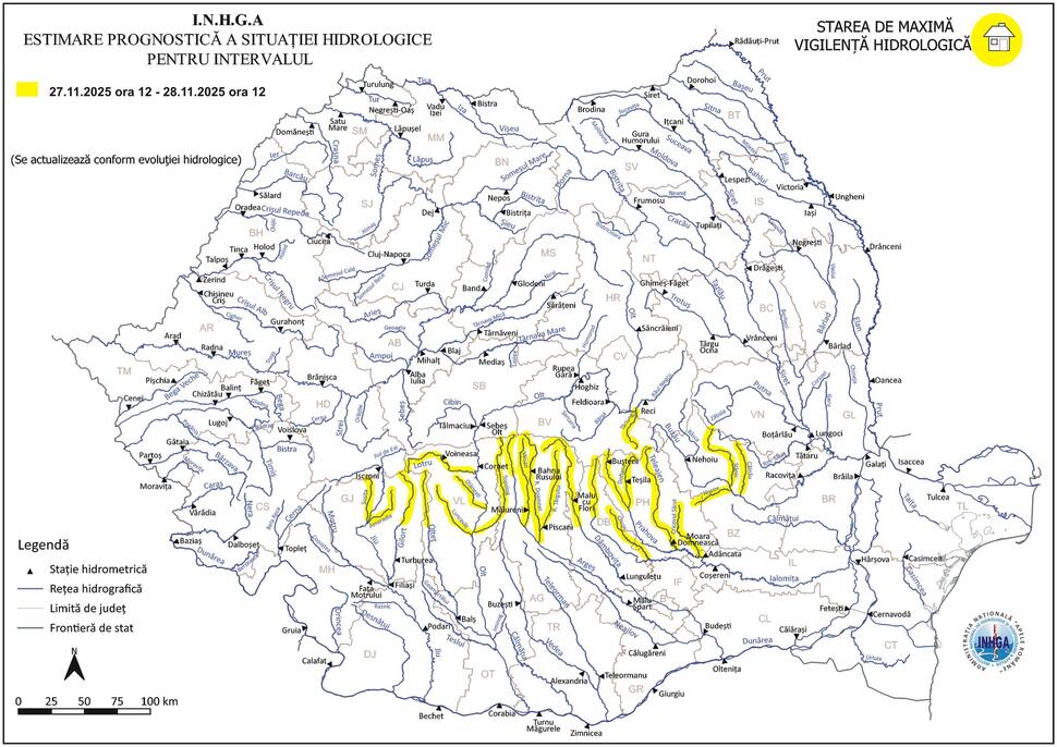 Atenţionarea Hidrologică vizează în principal fenomenele de scurgeri importante pe versanţi, torenţi şi pâraie, viituri rapide pe râurile mici cu posibile efecte de inundaţii locale, care se pot produce cu probabilitate şi intensitate mai mare pe unele răuri mici din judeţele: Argeş, Dâmboviţa şi Prahova.
