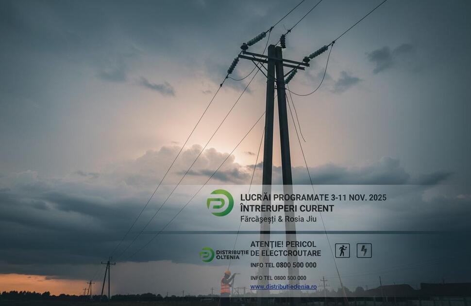 Locuitorii comunei Fărcășești sunt informați cu privire la programul de lucrări de prevenire și corectare a rețelelor electrice care vor avea loc în județul Gorj în perioada 3 - 11 noiembrie 2025.