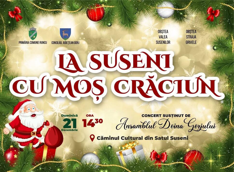 Duminică, 21 decembrie, Căminul Cultural Suseni va găzdui un eveniment cultural deosebit, dedicat comunității locale și, în mod special, copiilor din comună. Ansamblul Profesionist „Doina Gorjului” va susține un spectacol de excepție, aducând pe scenă tradițiile autentice ale folclorului gorjenesc.