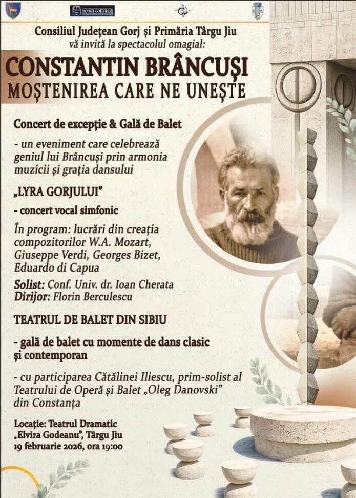 Consiliul Județean Gorj și Primăria Târgu Jiu organizează joi, 19 februarie 2026, spectacolul omagial „Constantin Brâncuși – Moștenirea care ne unește”, un eveniment cultural de excepție găzduit de Teatrul Dramatic „Elvira Godeanu” începând cu ora 19:00. Manifestarea celebrează geniul marelui sculptor printr-o fuziune între muzică și dans, oferind publicului un concert vocal-simfonic și o gală de balet.