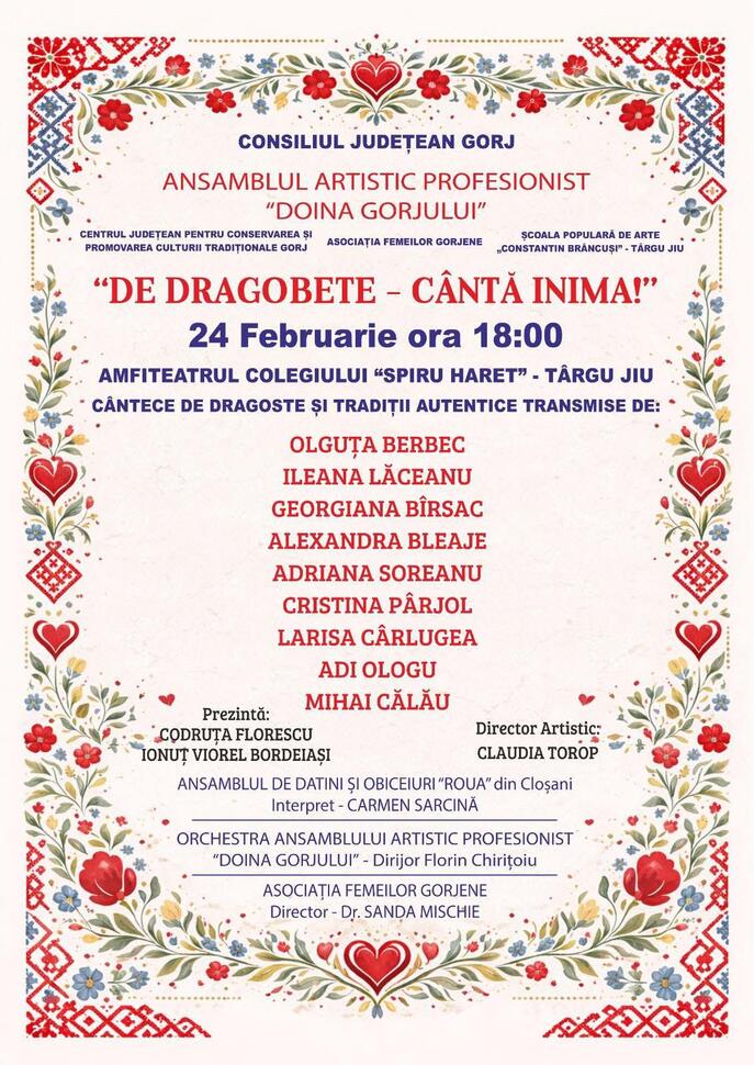 Iubitorii de folclor sunt invitați marți, 24 februarie 2026, la ora 18:00, în Amfiteatrul Colegiului „Spiru Haret” din Târgu Jiu, pentru a celebra sărbătoarea de Dragobete în cadrul spectacolului „De Dragobete – Cântă Inima!”.