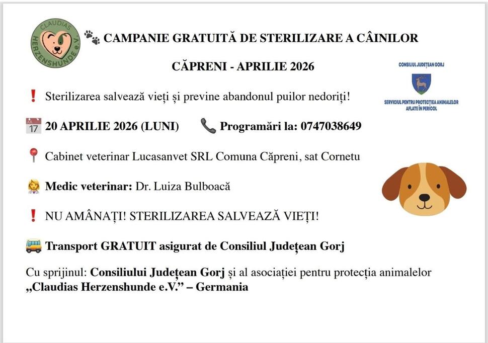 Locuitorii comunei Căpreni și ai satelor învecinate au o oportunitate importantă pentru sănătatea animalelor lor de companie. Luni, 20 aprilie 2026, va avea loc o nouă etapă a campaniei gratuite de sterilizare a câinilor, un proiect menit să reducă numărul animalelor abandonate și să asigure o viață mai sănătoasă pentru patrupezi.