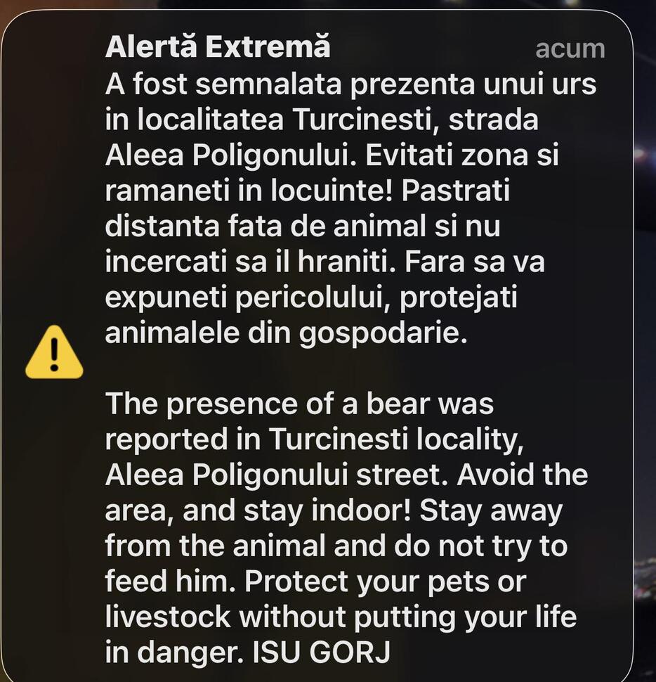 Mai mulți gorjeni au primit mesaj RO-Alert joi seara, după ce prezența unui urs a fost semnalată în localitatea Turcinești, pe strada Aleea Poligonului.
