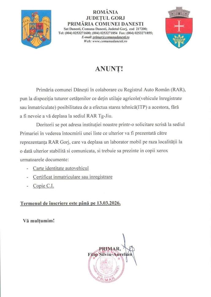 Primăria comunei Dănești a bătut palma cu Registrul Auto Român pentru a le ușura munca localnicilor care dețin utilaje agricole.