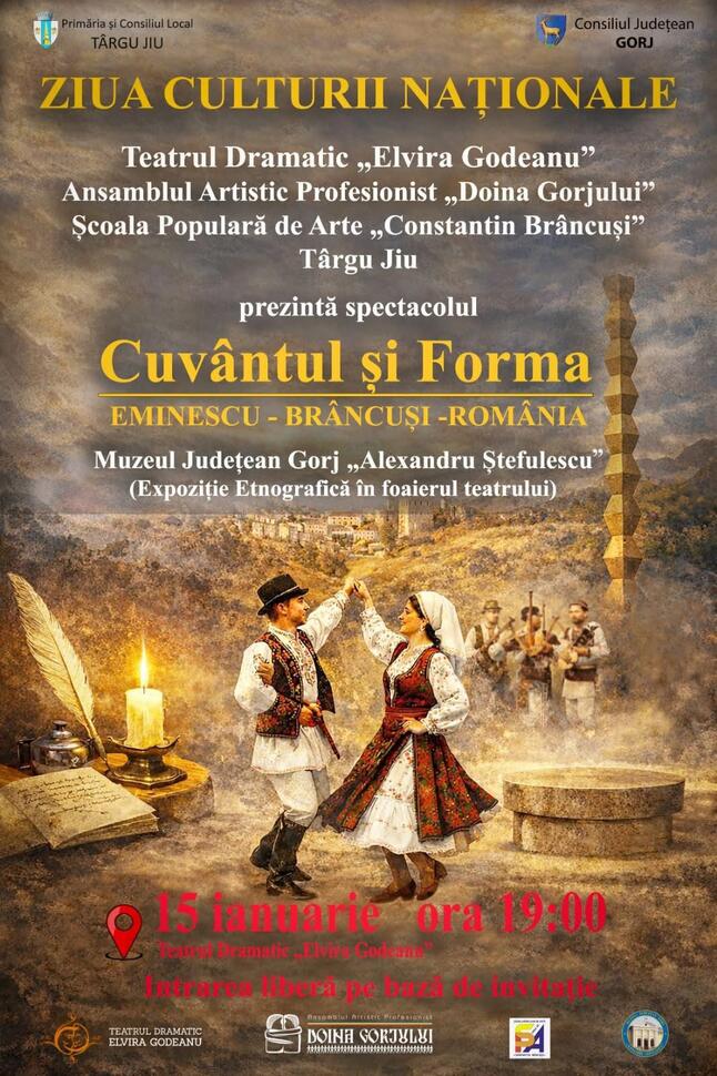 Publicul este invitat să ia parte la o celebrare a spiritului românesc, într-o reprezentație ce împletește armonios muzica, poezia și formele artistice. Evenimentul este rezultatul unei colaborări remarcabile între mai multe instituții emblematice ale județului Gorj, respectiv Teatrul Dramatic „Elvira Godeanu”, Ansamblul Artistic Profesionist „Doina Gorjului”, Școala Populară de Arte „Constantin Brâncuși” și Muzeul Județean Gorj „Alexandru Ștefulescu”.